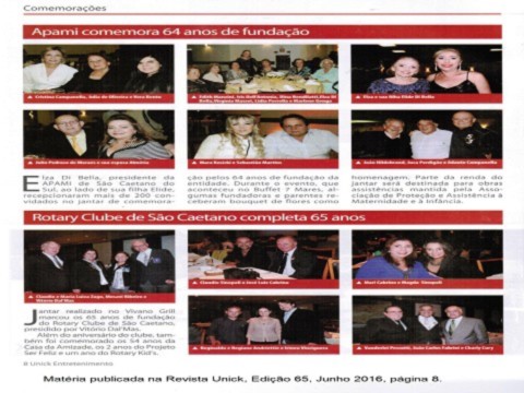 Comemorando seus 65 anos de fundação, o Rotary Club de São Caetano do Sul foi destaque ma mídia regional, tendo sido publicado o evento festivo em meia página da Revista UNICK, em sua edição de junho de 2016.