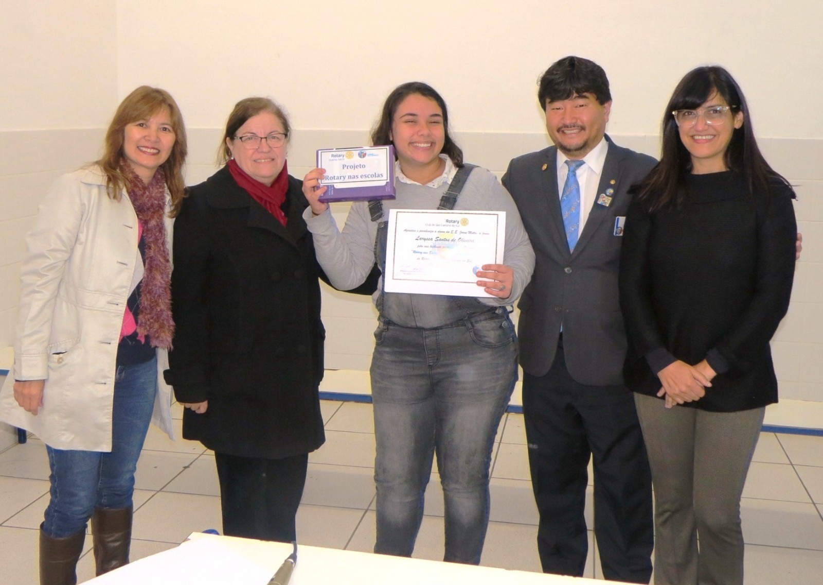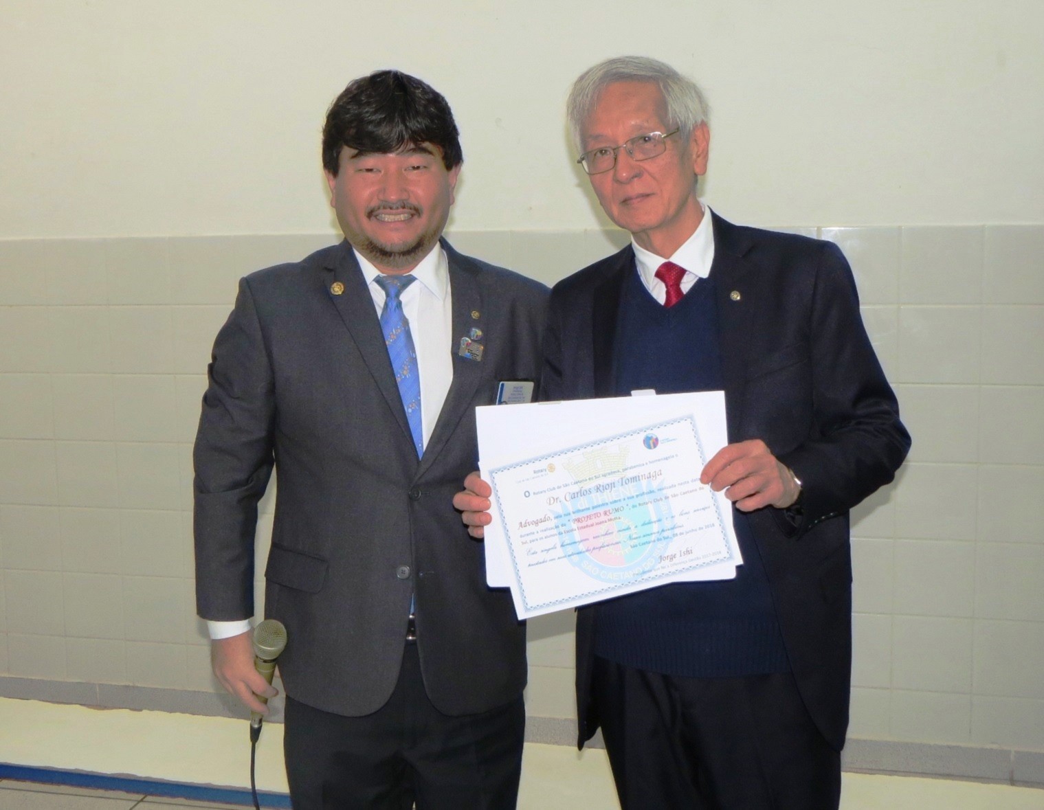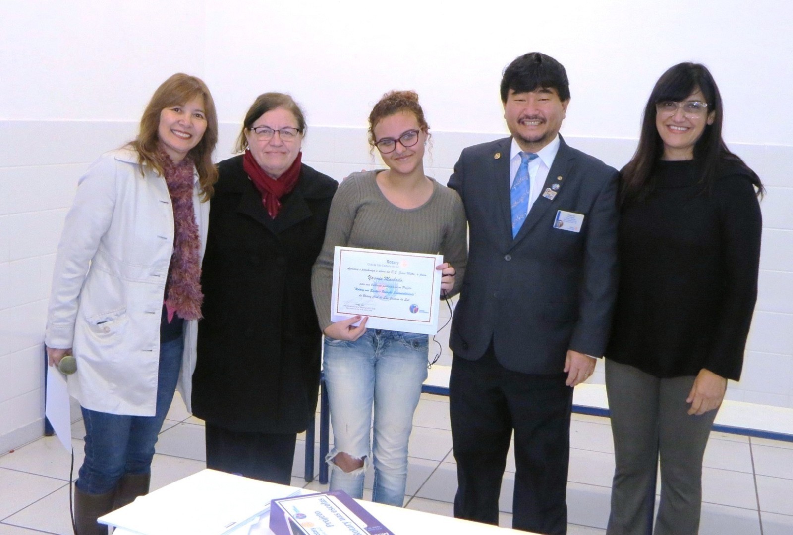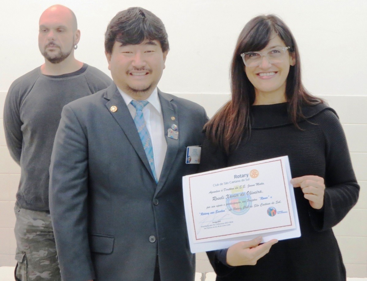 Os Rotarianos do Rotary Club de São Caetano do Sul estiveram na manha do dia 08 de junho de 2018 nas dependências da Escola Estadual Joana Motta, realizando mais uma edição do Projeto RUMO, neste final de gestão que fez a diferença do presidente Jorge Ishi. Presentes mais de 90 alunos do 3º ano do Ensino Médio da E.E. Joana Motta que tiveram a oportunidade de assistirem as palestras sobre vários temas profissionais: Medicina, com o doutor Caio Kawamura; Medicina Veterinária, doutor Caio Telloli; Direito, doutor Carlos Tominaga; Psicologia, Patrícia Ishi e Tecnologia da Informação, Sr. Denilton Souza. Na oportunidade, o Presidente que Faz a Diferença, Jorge Ishi, acompanhado dos companheiros Patrícia, Rosa Maria, Mosavi, Vitório e Cabrino, homenagearam os diretores e professores da Escola Joana Motta, entregando-lhes um certificado de agradecimento pela participação no Projeto Rotary nas Escolas ? Redação Sustentabilidade. As alunas Yasmin Machado, Beatriz Nascimento, Thayná Bomfin e Maria Clara Monteiro, receberam um certificado de agradecimento pela participação no Projeto Rotary nas Escolas- Redação Sustentabilidade sendo que a aluna Laryssa Santos de Oliveira, além de também receber o certificado, foi contemplada com um tablet, por ter sido autora de uma das redações premiadas no Distrito. Em pronunciamento aos alunos, professores e rotarianos, o presidente Jorge Ishi destacou a importância da participação de jovens estudantes nos projetos de Rotary International, em especial no Rotary nas Escolas, onde alunos dessa Escola Estadual Joana Motta foram muito bem classificados e na participação das palestras do Projeto RUMO, cujo objetivo é ouvir de profissionais de importantes áreas de atuação e terem orientação para a escolha de suas formações profissionais.