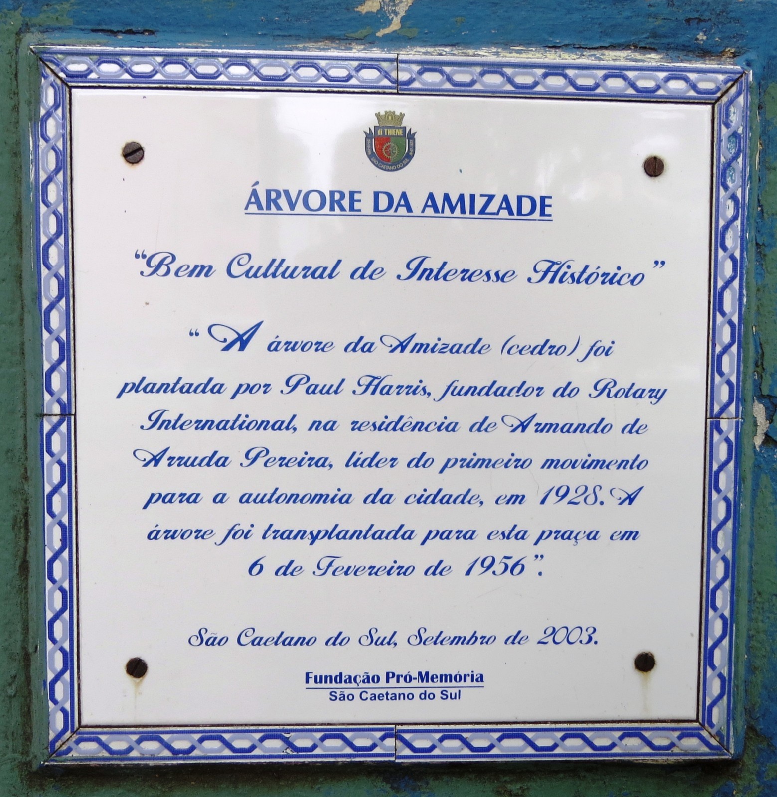 Com o lema SEJA A INSPIRAÇÃO, nesse ano rotário 2018-2019, o casal Governador Carlos Torci e sua esposa Sonia Mara foram recepcionados pela presidente do Rotary Club de São Caetano do Sul, Rosa Maria Riera, na praça Luiz Olinto Tortorello, situada no quadrilátero compreendido entre a avenida Goiás, rua Manoel Coelho, rua Jayme da Costa Patrão e rua Rio Grande do Sul, local onde se encontra a Árvore da Amizade, que foi plantada no ano de 1.936 pelo fundador do Rotary International, Paul Percy Harris, que estava em visita ao Brasil, na residência do presidente do Rotary Club de São Paulo, o engenheiro Armando de Arruda Pereira, que residia no bairro Cerâmica, em São Caetano do Sul.