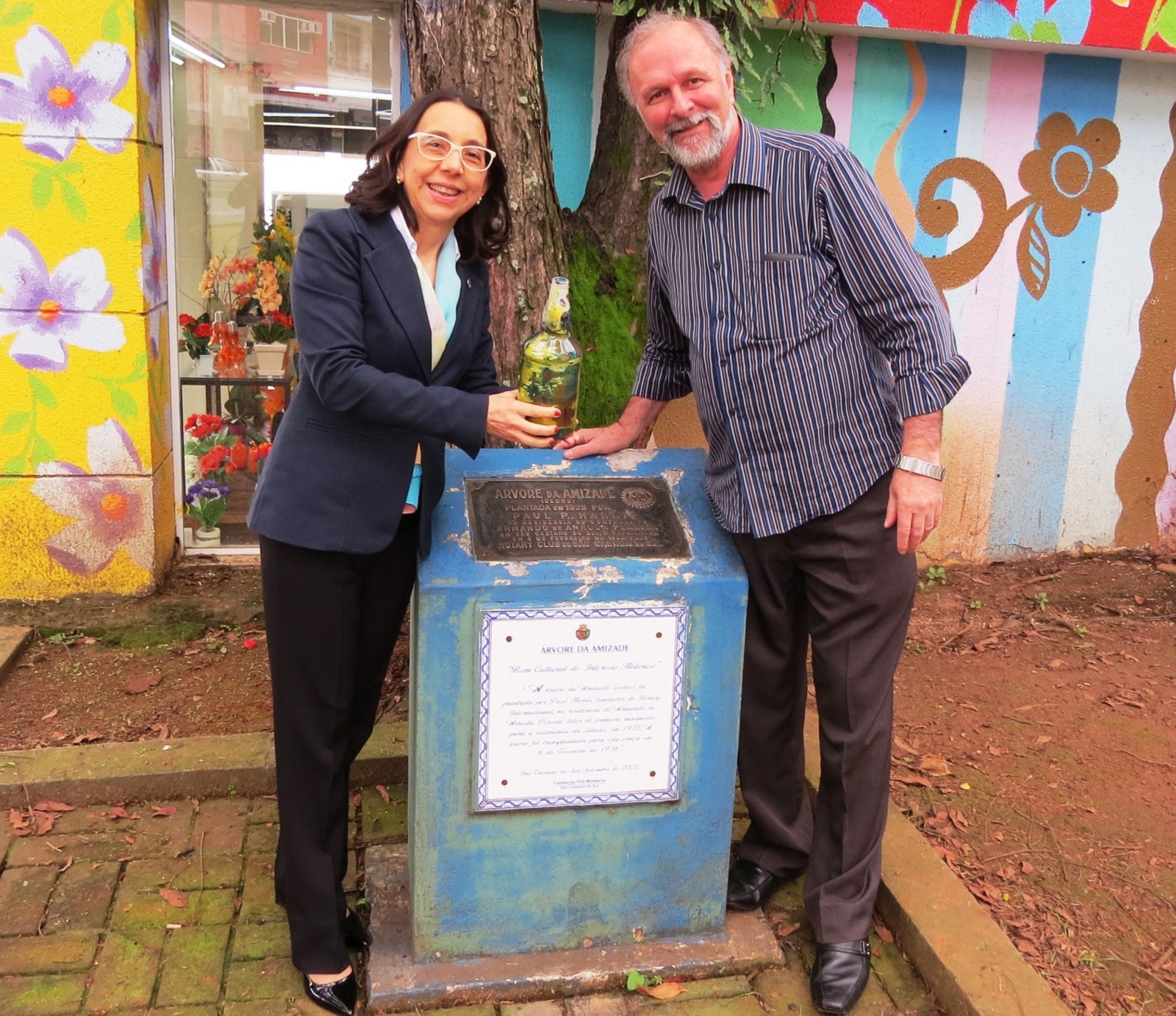 Acompanhada pelos rotarianos Vitório, Sandra, Alessandro e Cabrino, a presidente Rosa Maria, como tradicionalmente ocorre por ocasião das visitas dos governadores do Distrito 4420 à Árvore da Amizade, presenteou o Governador Torci uma folha e um pequeno fragmento da casca da famosa árvore, eis que historicamente, esteve nas mãos de Paul Percy Harris, o fundador do Rotary International há exatos 83 anos.