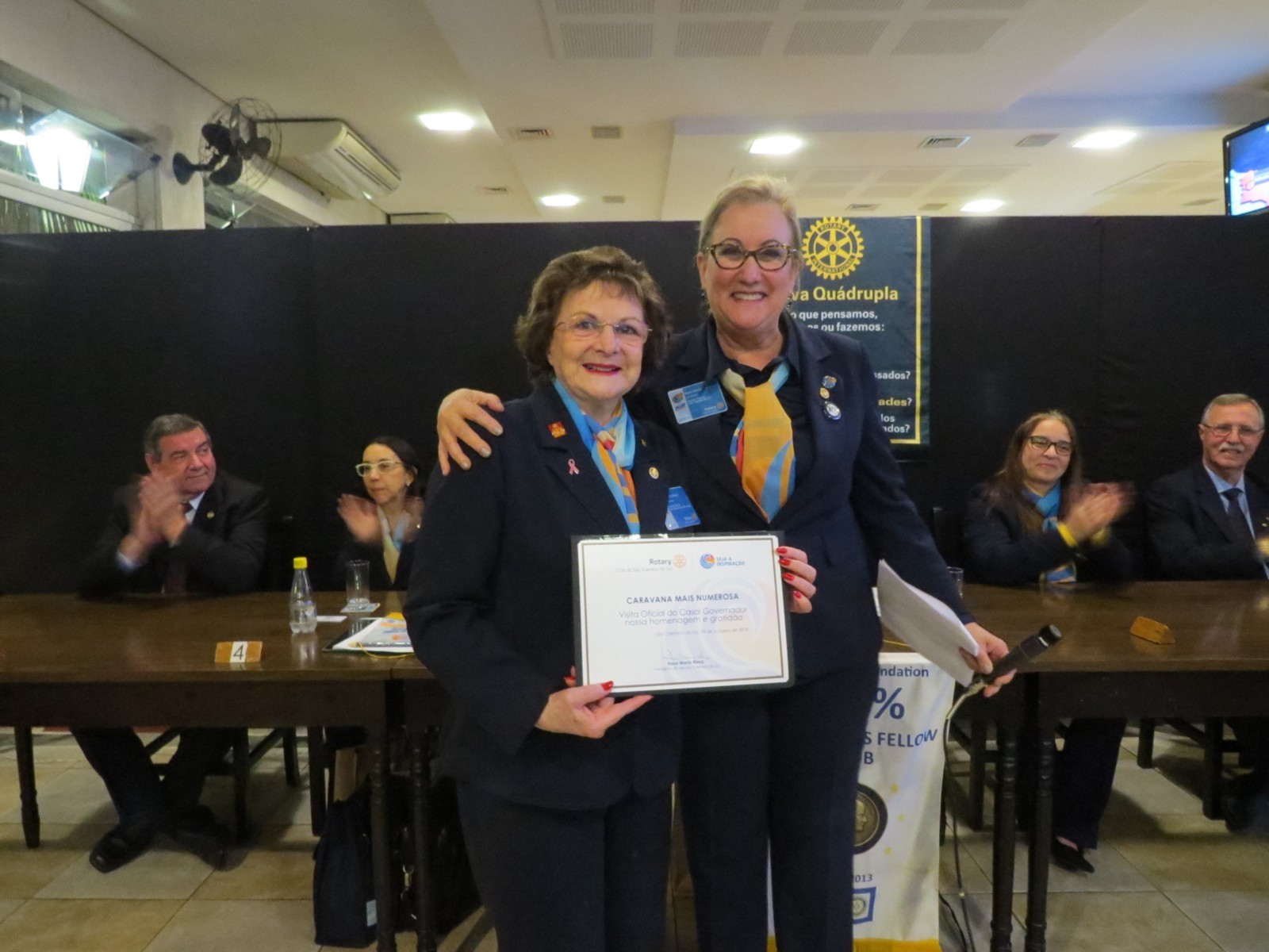 Encerrada a Assembleia, a comitiva dirigiu-se ao restaurante 7 Mares, onde se realizou a reunião festiva de visita do Governador, tendo sido e mesa diretora dos trabalhos presidida pela presidente Rosa Maria Riera e composta por Carlos Eduardo Estevam Torcia, Governador do Distrito 4420 do Rotary International; Sonia Mara, esposa do Governador Torci; Marcos Antonio Viola, representando a presidente da Casa da Amizade de São Caetano do Sul; Monica de Sordi Martão, presidente do Rotary Club de São Caetano do Sul Olímpico; Vanderlei Moreira dos Santos, Presidente da Fundação de Rotarianos de São Caetano do Sul e Elísio Peixoto, Secretário do COMCIPAS ( Conselho Municipal de Cidadania e Participação Social de São Caetano do Sul ), representando o Prefeito Municipal José Aurichio Júnior.