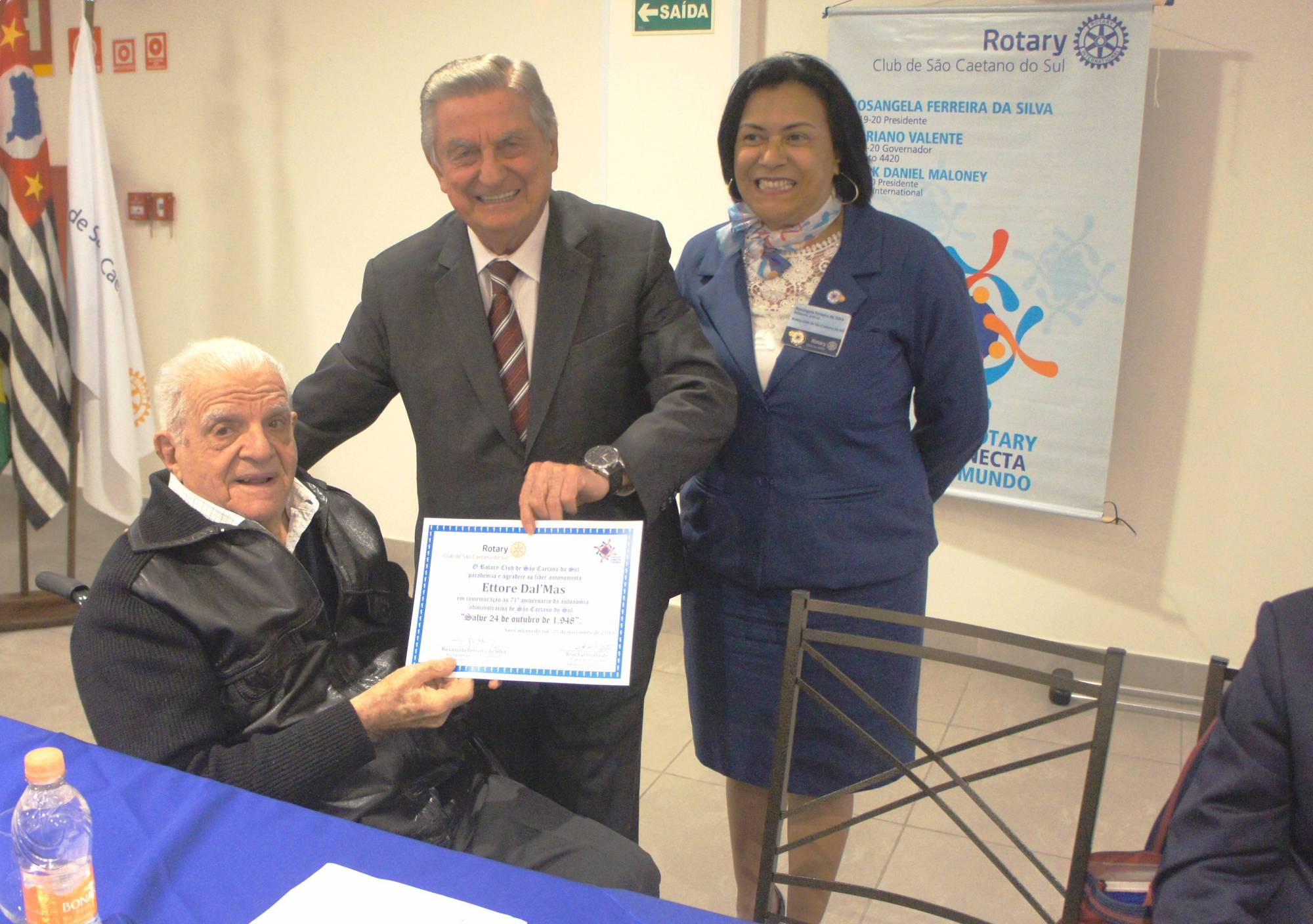 A presidente, “que conecta o mundo”, do Rotary Club de São Caetano do Sul, Rosangela Ferreira da Silva recebeu, com o carinho e respeito a que fazem jus, os lideres autonomistas Ettore Dal’Mas ( rotariano ) e Desirèe Malateaux Netto para serem devidamente homenageados pelo Rotary Club de São Caetano do Sul, em função de seus atos de bravura ocorridos no longínquo ano de 1948 e que culminaram com a autonomia de São Caetano do Sul.
