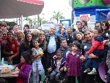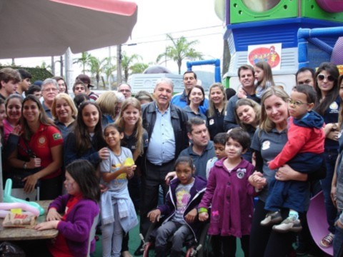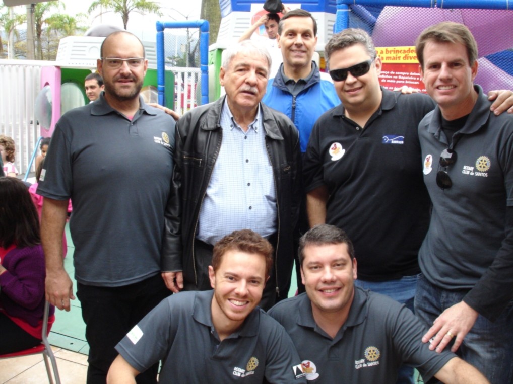 Na foto, rotarianos do RC Santos e várias crianças prestigiando a campanha McDia Feliz, que incentiva o combate ao câncer infantil.